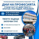 На 15-16 май 2025 г. в Професионална гимназия по транспорт – Русе се състояха „Дни на професията“ в изпълнение на Дейност 9 „Информационни дейности и кампании, насочени към повишаване на привлекателността на професионалното образование и укрепване връзката между ученици и родители.“ по Проект BG05SFPR001-3.001-0001 „Модернизиране на професионалното образование обучение‘‘.